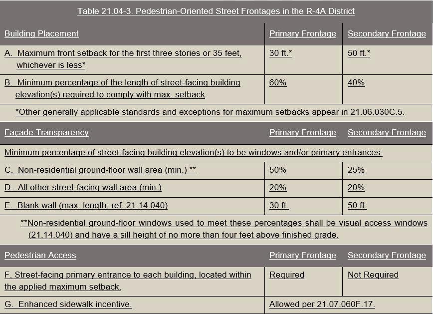 For example, I developed the below SketchUp model and zoning text table for the Community Discussion Draft of the R-4A text amendment. The model and table were proposed to be included in the zoning code so that the design standards could be more easily interpreted.